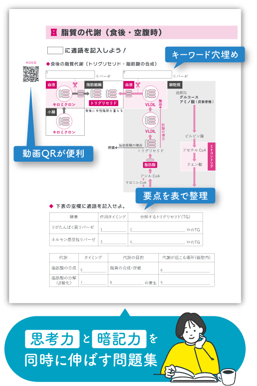 ワークブックは、全9科目に対応した書き込み式の問題集です。図を見ながらキーワードを穴埋めしたり、要点を表で整理したり、問題を解いたりすることで、各科目のポイントを効率的に勉強することができます。QRコードから視聴できる動画解説も便利です。