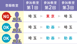 参加教室の変更は、不可とします。ただし、『動画』以外の6教室へご登録された会員様が『動画』へ変更することは可能です。
